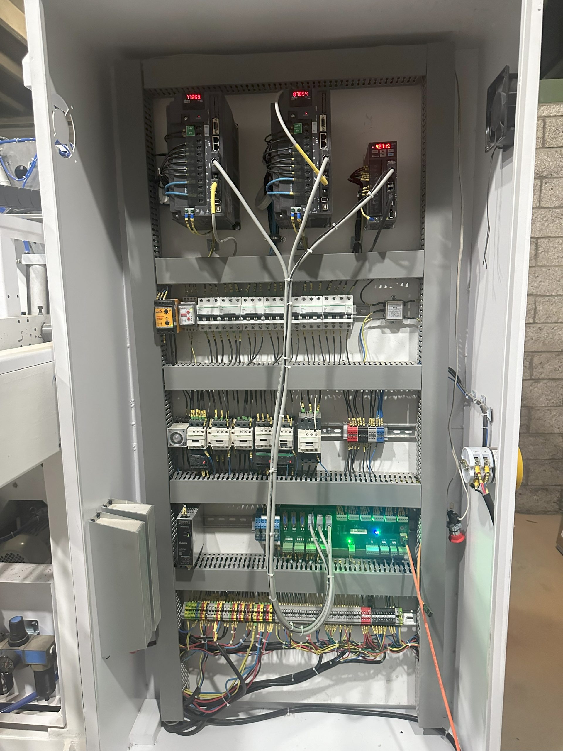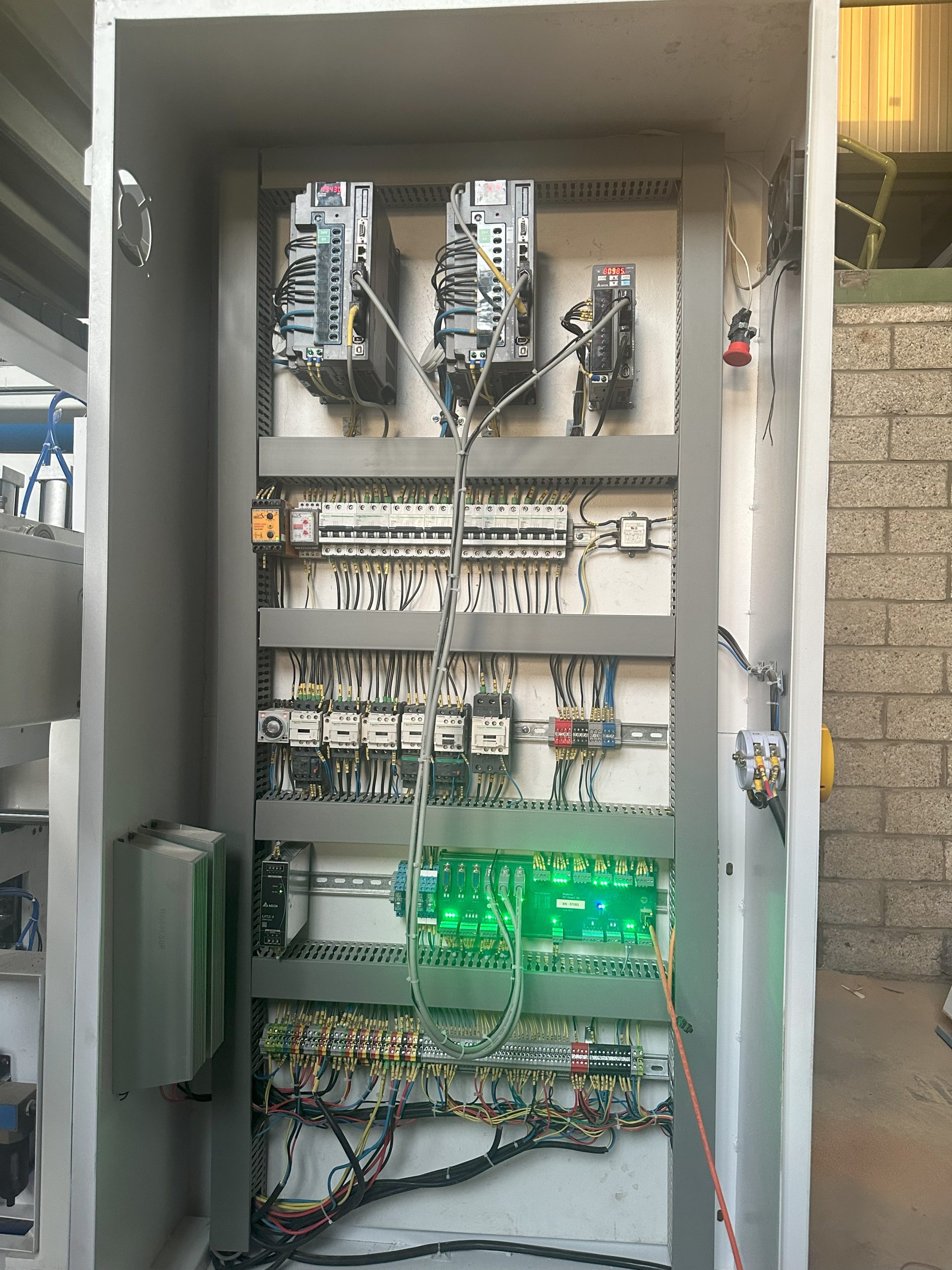 In this CNC Panel Cutting Machine Electrical Panel Design and Automation project, completed in 2024, we built a full control solution for a Cut Master machine. Delta servo drivers power the pusher, carriage and aligner axes. A Radonix controller centralizes all parameters and communicates with our in-house software, which sends commands and collects real-time data. The result is precise alignment, faster changeovers, safer operation, and durable performance with organized wiring and industrial standards. Benefits include predictive maintenance and accurate results.